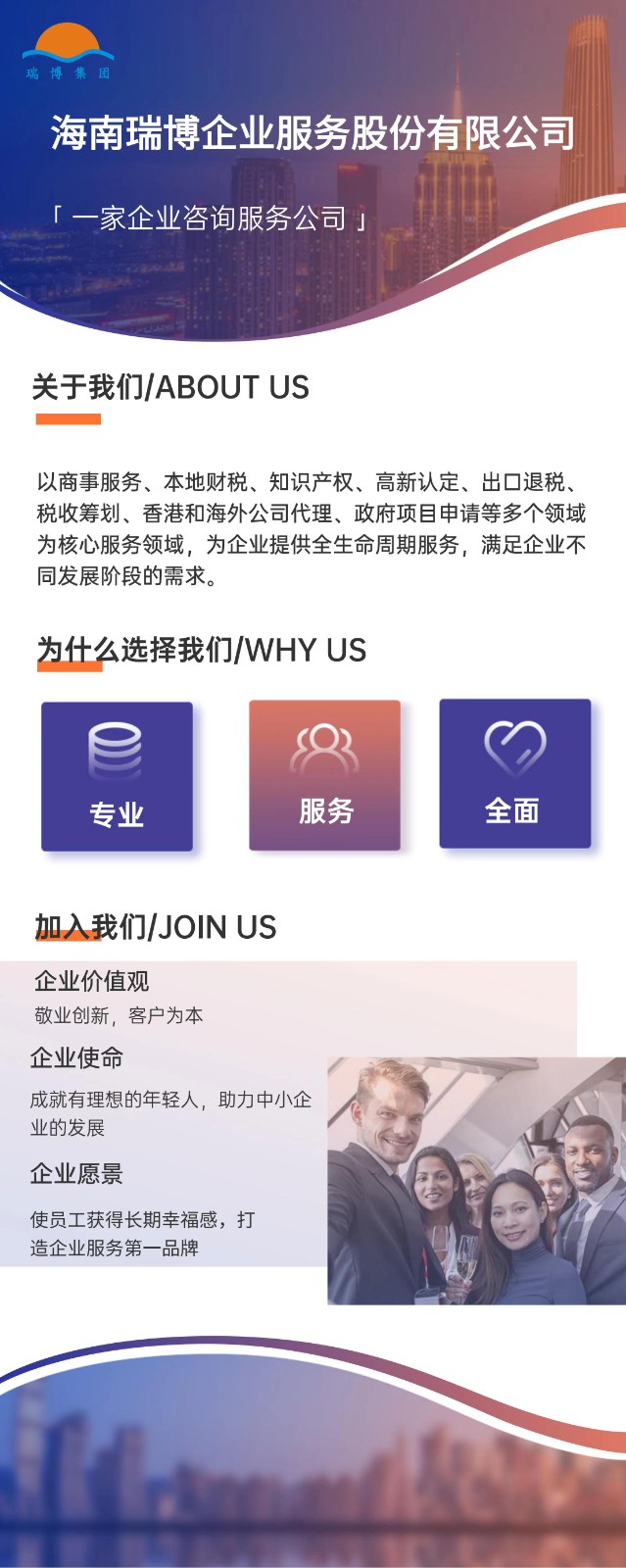 企業(yè)說明: | 海南瑞博企業(yè)服務(wù)股份有限公司是瑞博集團(tuán)下屬子公司,自2018年海南自貿(mào)港開放以來。瑞博集團(tuán)積極響應(yīng)國家的號召,通過充分考察后,于海南省??谑谐闪⒑D先鸩┢髽I(yè)服務(wù)股份有限公司,主要以商事服務(wù)、本地財(cái)稅、知識產(chǎn)權(quán)、高新認(rèn)定、出口退稅、稅收籌劃、香港和海外公司代理、政府項(xiàng)目申請等多個(gè)領(lǐng)域?yàn)楹诵姆?wù)領(lǐng)域,為企業(yè)提供全生命周期服務(wù),滿足企業(yè)不同發(fā)展階段的需求。 瑞博集團(tuán)下屬直營子公司分部在北京、西安、海南、香港等地,全國主要一二線城市的分部陸續(xù)成立中,跨區(qū)域配合,輻射全國,以滿足客戶跨區(qū)域服務(wù)需求;同時(shí)瑞博持續(xù)拓展延伸資源合作平臺,引入各類商業(yè)服務(wù)機(jī)構(gòu)供應(yīng)鏈合作機(jī)構(gòu),打通了產(chǎn)業(yè)鏈上下游領(lǐng)域的立體服務(wù)生態(tài),企業(yè)全品類服務(wù)能力,得到了廣大的客戶的認(rèn)可與信賴。 |