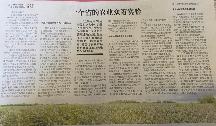 “眾籌海南”作為海南股權(quán)交易中心推動(dòng)海南特色產(chǎn)業(yè)發(fā)展的一項(xiàng)重要舉措,持續(xù)受到媒體關(guān)注。最近,面向全國(guó)公開(kāi)發(fā)行的具有鮮明法治特色的中央級(jí)主流政經(jīng)周報(bào)——《法治周末》以半版篇幅刊發(fā)了《一個(gè)省的農(nóng)業(yè)眾籌實(shí)驗(yàn)》專(zhuān)題文章。