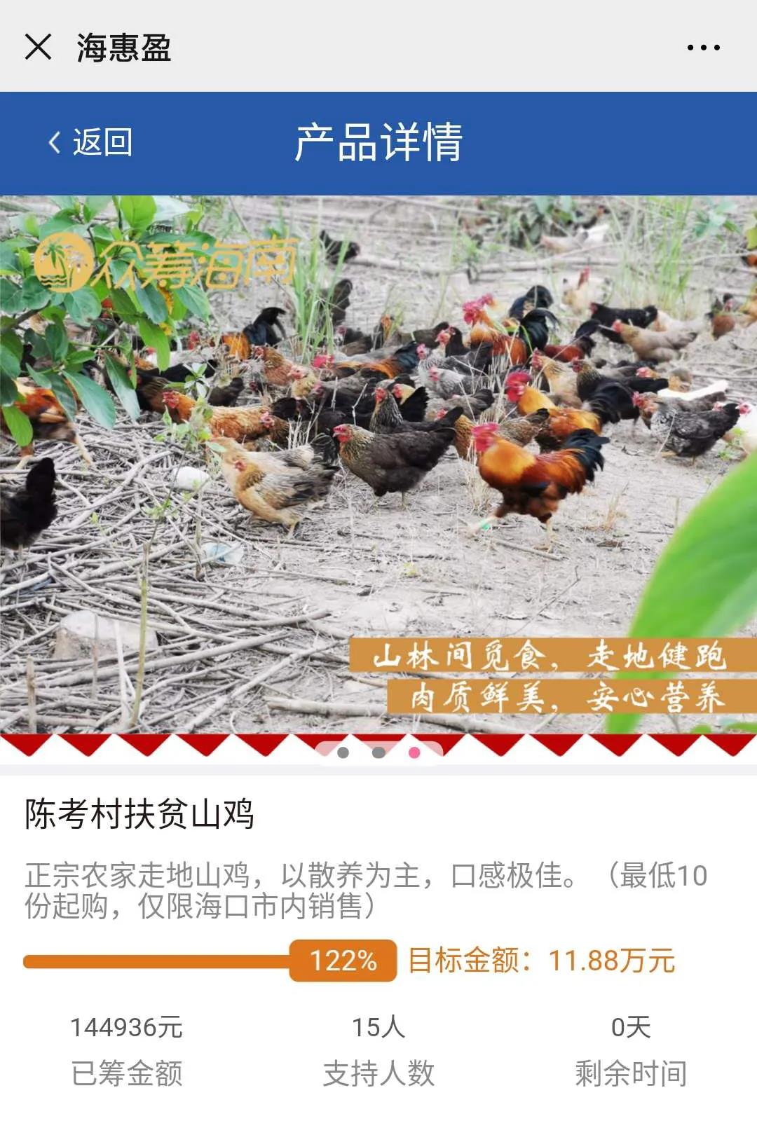 為了持續(xù)幫助海南省樂東縣大安鎮(zhèn)陳考村村民打開當?shù)貎?yōu)質農(nóng)產(chǎn)品的銷路,在海南證監(jiān)局的指導下,海南股交借助“互聯(lián)網(wǎng)+農(nóng)業(yè)眾籌”的形式,再次幫助陳考村村民享受“互聯(lián)網(wǎng)+”的發(fā)展紅利。海南股交旗下綜合金融服務平臺“?;萦庇?月7日推出“陳考村扶貧山雞”項目,開啟新一期的扶貧眾籌活動,截止4月27日,該項目完成率122%,眾籌金額14.4萬余元。