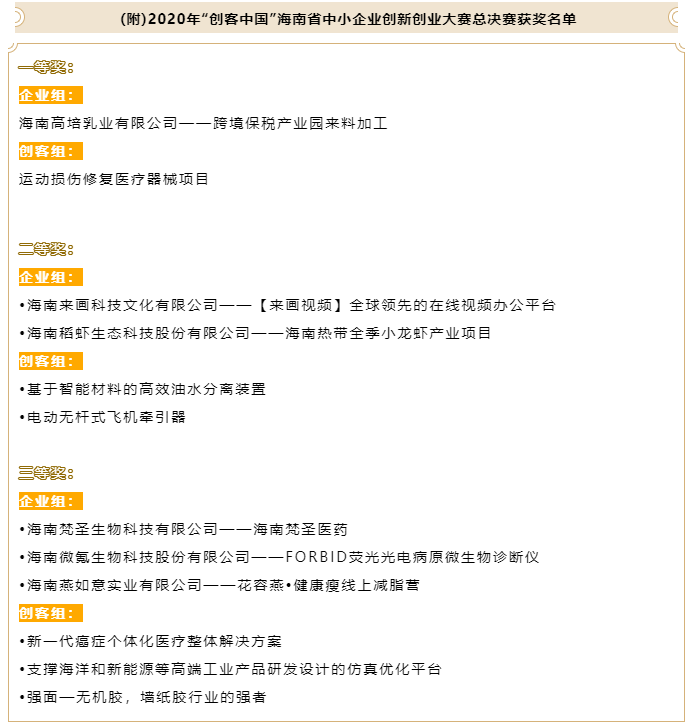 逐夢自貿(mào)港,創(chuàng)贏海之南。8月26日下午,由海南省工業(yè)和信息化廳、海南省財政廳主辦,海南股權(quán)交易中心承辦、深圳證券信息有限公司、陵水互聯(lián)網(wǎng)創(chuàng)業(yè)產(chǎn)業(yè)園協(xié)辦的2020年“創(chuàng)客中國”海南省中小企業(yè)創(chuàng)新創(chuàng)業(yè)大賽總決賽暨項目融資路演在??谂e行。通過2天近15個小時的路演和現(xiàn)場答辯,30強(qiáng)項目現(xiàn)場PK、同臺競技,最終,“跨境保稅產(chǎn)業(yè)園來料加工”和“運動損傷修復(fù)醫(yī)療器械”項目分獲海南賽區(qū)決賽企業(yè)組和創(chuàng)客組一等獎。