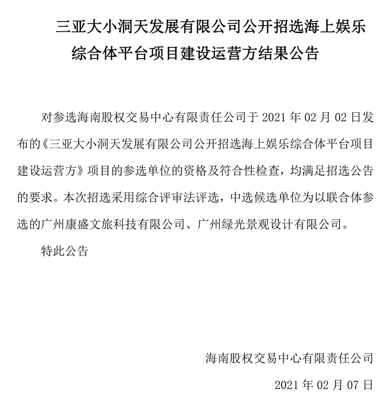 三亞大小洞天發(fā)展有限公司公開招選海上娛樂綜合體平臺(tái)項(xiàng)目建設(shè)運(yùn)營方結(jié)果公告
