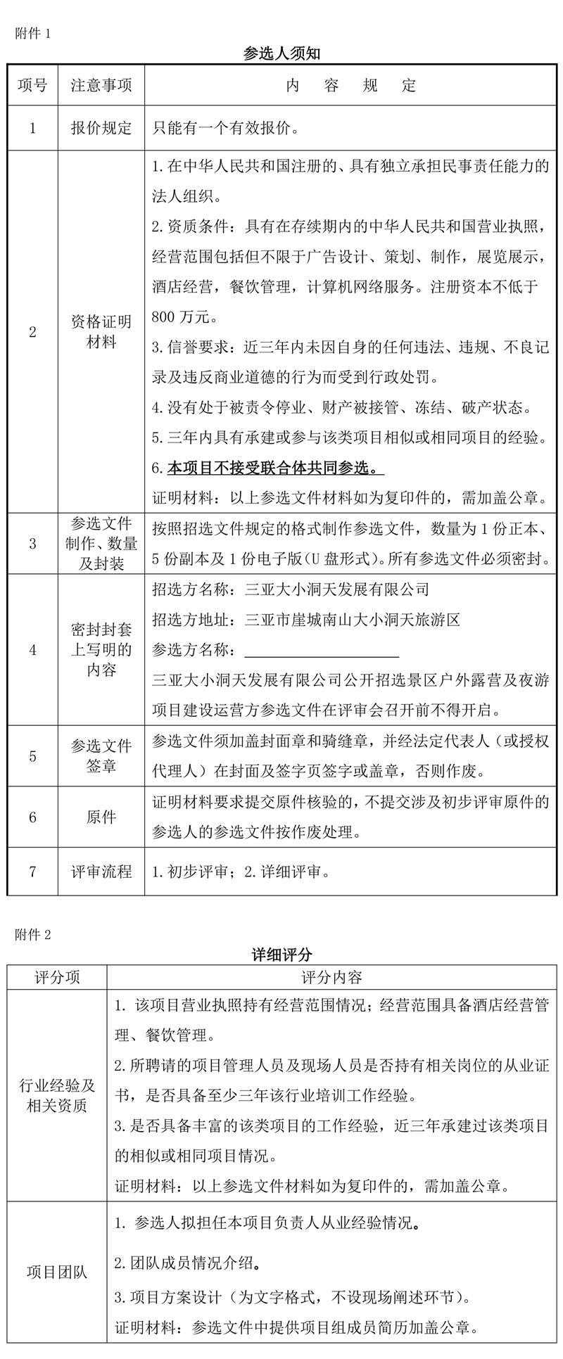 根據(jù)相關(guān)法律法規(guī),受委托,海南股權(quán)交易中心有限責(zé)任公司公開招選景區(qū)戶外露營及夜游項目建設(shè)運營方,為三亞大小洞天景區(qū)的戶外露營及夜游項目提供盡職調(diào)查、方案設(shè)計、項目報批、項目建設(shè)、施工、安裝、調(diào)試、驗收及運營管理等服務(wù)工作。歡迎符合條件的機構(gòu)遵照本公告的有關(guān)規(guī)定報名參加,現(xiàn)將有關(guān)事項公告如下: