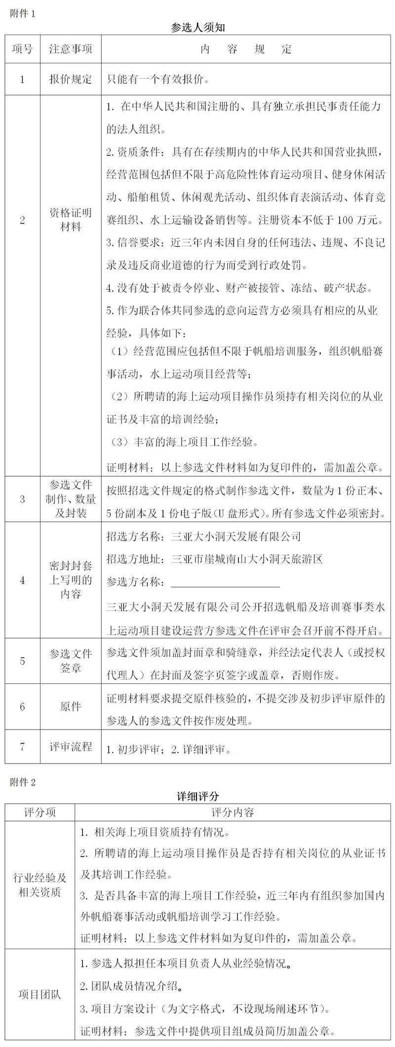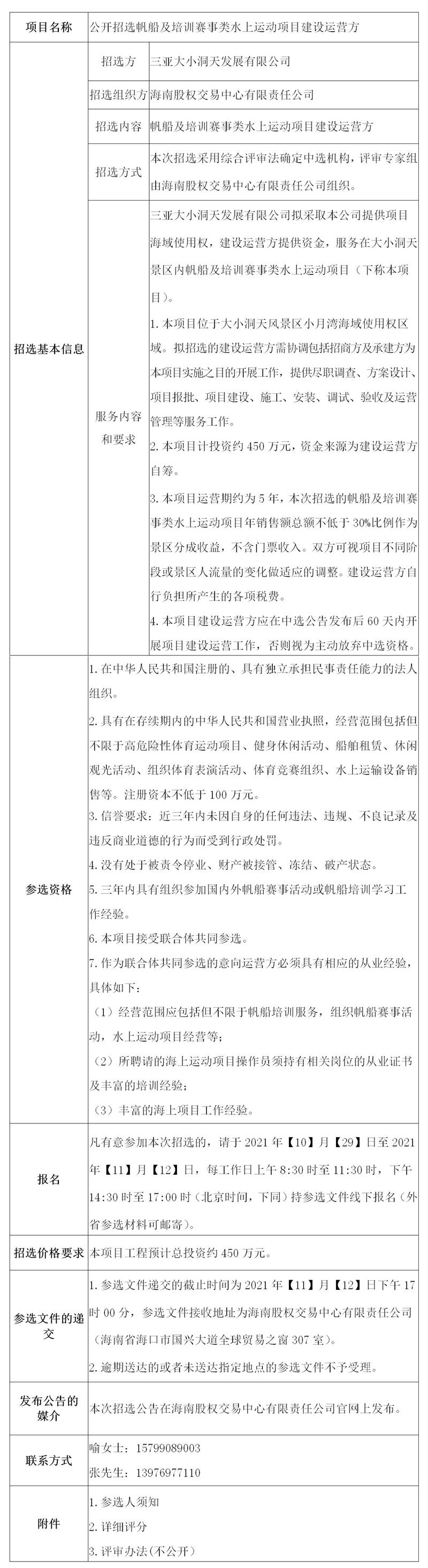 根據(jù)相關(guān)法律法規(guī),受委托,海南股權(quán)交易中心有限責(zé)任公司公開(kāi)招選帆船及培訓(xùn)賽事類(lèi)水上運(yùn)動(dòng)項(xiàng)目建設(shè)運(yùn)營(yíng)方,為三亞大小洞天景區(qū)的帆船及培訓(xùn)賽事類(lèi)水上運(yùn)動(dòng)項(xiàng)目提供盡職調(diào)查、方案設(shè)計(jì)、項(xiàng)目報(bào)批、項(xiàng)目建設(shè)、施工、安裝、調(diào)試、驗(yàn)收及運(yùn)營(yíng)管理等服務(wù)工作。歡迎符合條件的機(jī)構(gòu)遵照本公告的有關(guān)規(guī)定報(bào)名參加,現(xiàn)將有關(guān)事項(xiàng)公告如下:
