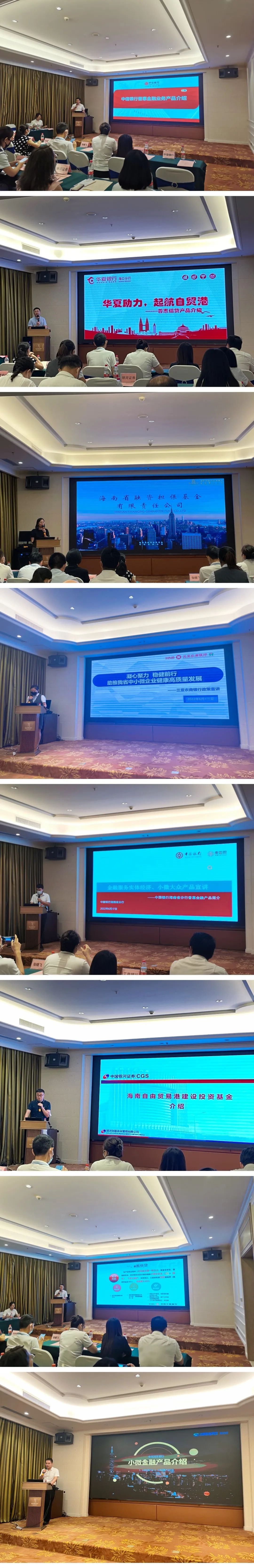 活動邀請了中國銀行、工商銀行、中信銀行、民生銀行、華夏銀行、三亞農(nóng)商行、省融資擔(dān)保、銀河證券進行惠企政策及金融產(chǎn)品宣貫。針對目前中小企業(yè)普遍存在抵押、擔(dān)保物不足,信息不對稱,融資途徑單一,企業(yè)的發(fā)展后勁不足等現(xiàn)狀問題,8家參會金融機構(gòu)相關(guān)業(yè)務(wù)負責(zé)人分別介紹了各自普惠金融信貸產(chǎn)品和為企業(yè)提供的優(yōu)質(zhì)服務(wù)經(jīng)驗,分享了企業(yè)融資案例。