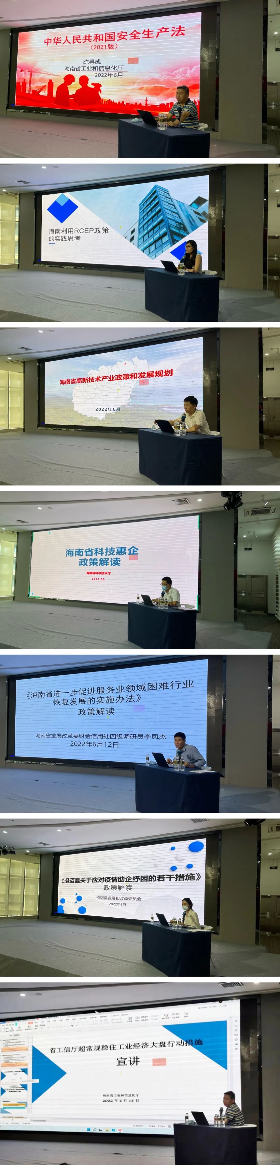 會上,海南省工業(yè)和信息化廳、海南省科學技術(shù)廳、海南省發(fā)展和改革委員會、澄邁縣發(fā)展和改革委員會等相關(guān)部門針對我省中小企業(yè)紓困扶持政策進行宣貫,重點解讀了《保障中小企業(yè)款項支付條例》《安全生產(chǎn)法》《海南工信財政措施實施細則》《海南省工信廳超常規(guī)穩(wěn)住工業(yè)經(jīng)濟大盤行動措施》《海南省高新技術(shù)產(chǎn)業(yè)政策和發(fā)展規(guī)劃》《海南利用RCEP政策的實踐思考》《海南省獲批國家級研發(fā)設計平臺資助實施細則》《海南省科技型中小企業(yè)認定管理暫行辦法》《海南省進一步促進服務業(yè)領(lǐng)域困難行業(yè)恢復發(fā)展實施辦法》《澄邁縣關(guān)于應對疫情助企紓困的若干措施》等一系列關(guān)于幫扶中小企業(yè)的政策。