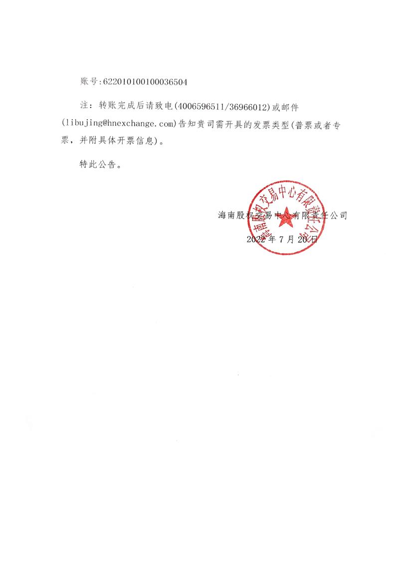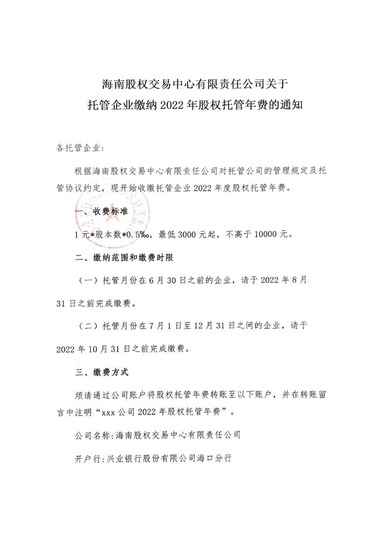 海南股權交易中心有限責任公司關于托管企業(yè)繳納2022年股權托管年費的通知