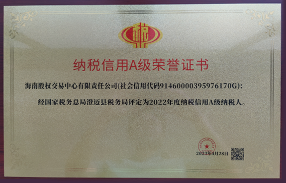 近日,在國(guó)家稅務(wù)總局澄邁縣稅務(wù)局納稅信用等級(jí)評(píng)定工作中,海南股交獲得“2022年度納稅信用A級(jí)納稅人”榮譽(yù)。