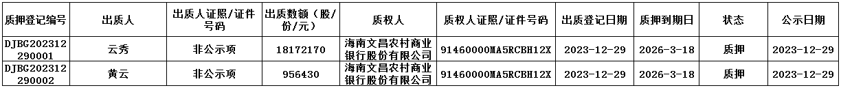 海南勵(lì)昌煙花炮竹銷售股份有限公司(企業(yè)代碼:993913)股東云秀、黃云于2023年12月29日在我中心辦理了股權(quán)質(zhì)押登記業(yè)務(wù),具體情況如下: