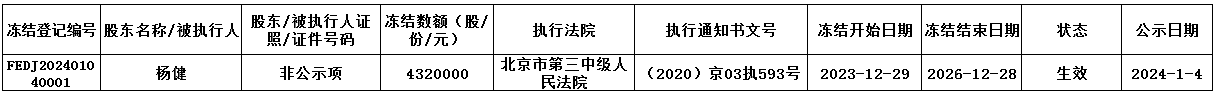 依據(jù)北京市第三中級人民法院《協(xié)助執(zhí)行通知書》[(2020)京03執(zhí)593號],我中心為海南臨高農(nóng)村商業(yè)銀行股份有限公司(企業(yè)代碼:893508)股東楊健辦理股權(quán)凍結(jié)登記,具體情況如下: