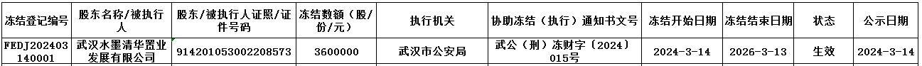 依據(jù)武漢市公安局《協(xié)助凍結(jié)財(cái)產(chǎn)通知書(shū)》[武公(刑)凍財(cái)字〔2024〕015號(hào)]文件,我中心為海南屯昌長(zhǎng)江村鎮(zhèn)銀行股份有限公司(企業(yè)代碼:893524)股東武漢水墨清華置業(yè)發(fā)展有限公司辦理股權(quán)凍結(jié)登記,具體情況如下: