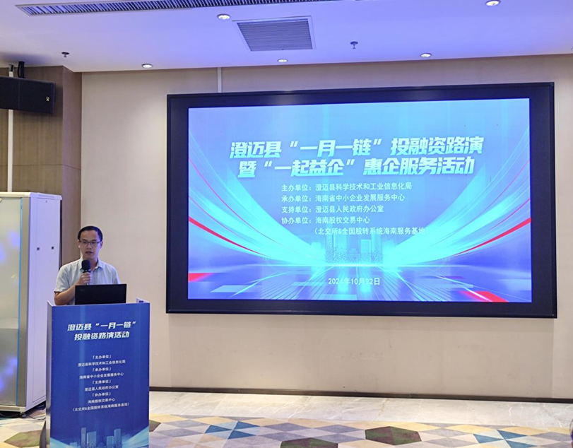 為進(jìn)一步活躍澄邁縣投融資氛圍,實(shí)現(xiàn)企業(yè)與資本的高效聯(lián)合,10月22日,澄邁縣“一月一鏈”投融資路演暨“一起益企”惠企服務(wù)活動在老城科技新城成功舉辦。本次活動由澄邁縣科學(xué)技術(shù)和工業(yè)信息化局主辦、海南省中小企業(yè)發(fā)展服務(wù)中心承辦、澄邁縣人民政府辦公室支持、海南股權(quán)交易中心協(xié)辦,相關(guān)投融資機(jī)構(gòu)以及中小企業(yè)代表等共計(jì)三十余人參加活動。