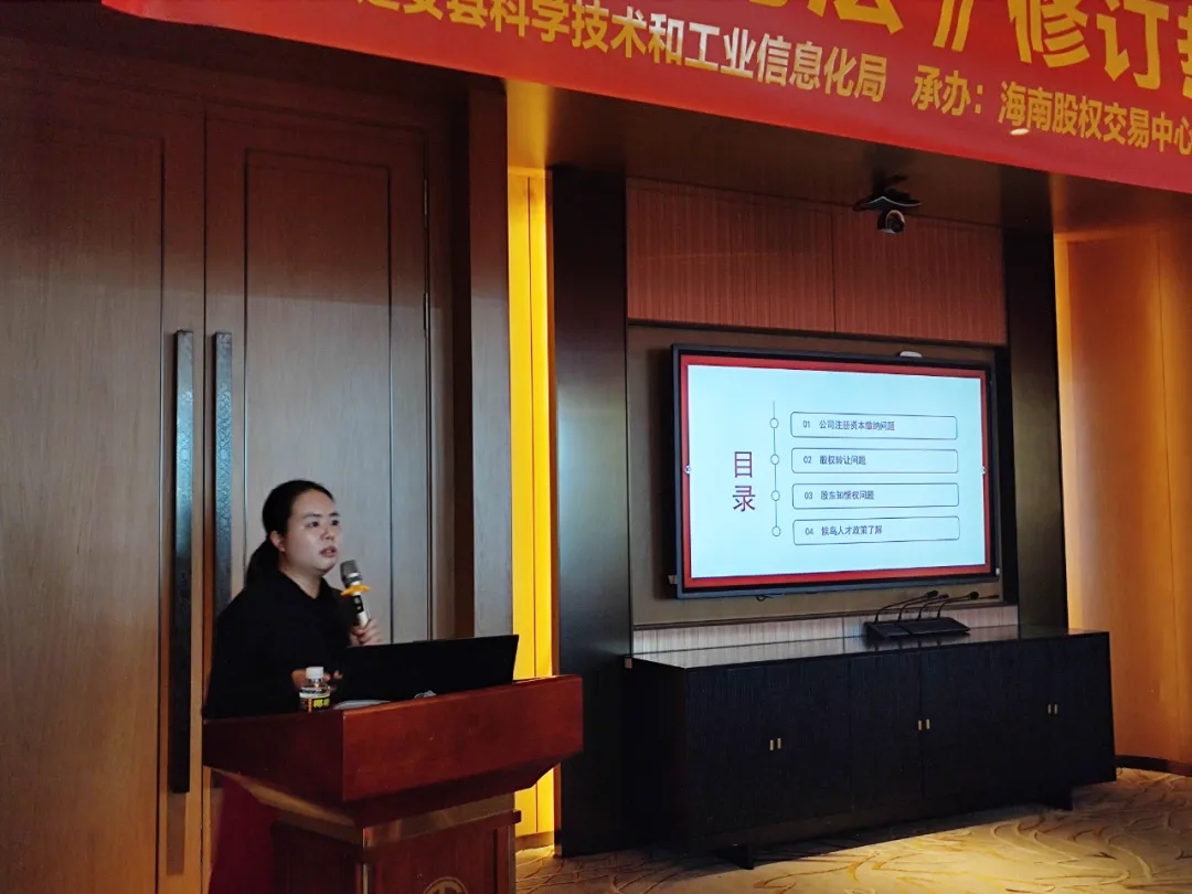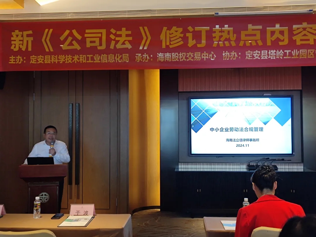 本次培訓旨在深入解讀新《公司法》修訂熱點內(nèi)容和《勞動法》的核心內(nèi)容,探討企業(yè)合規(guī)管理策略,助力企業(yè)健康發(fā)展?;顒佑啥ò部h科學技術和工業(yè)信息化局主辦,海南股權交易中心承辦,定安縣塔嶺工業(yè)園區(qū)管理委員會、定安縣工商業(yè)聯(lián)合會協(xié)辦,海南法立信律師事務所提供支持。