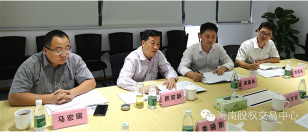 4月13日下午,由海南省人民政府研究室副主任熊安靜帶隊的省金融辦、省旅游委調(diào)研組一行,到海南股權(quán)交易中心走訪調(diào)研。海南股權(quán)交易中心董事長李曉剛,組織各部門負(fù)責(zé)人召開座談會,詳細(xì)介紹了本中心的運(yùn)行情況。